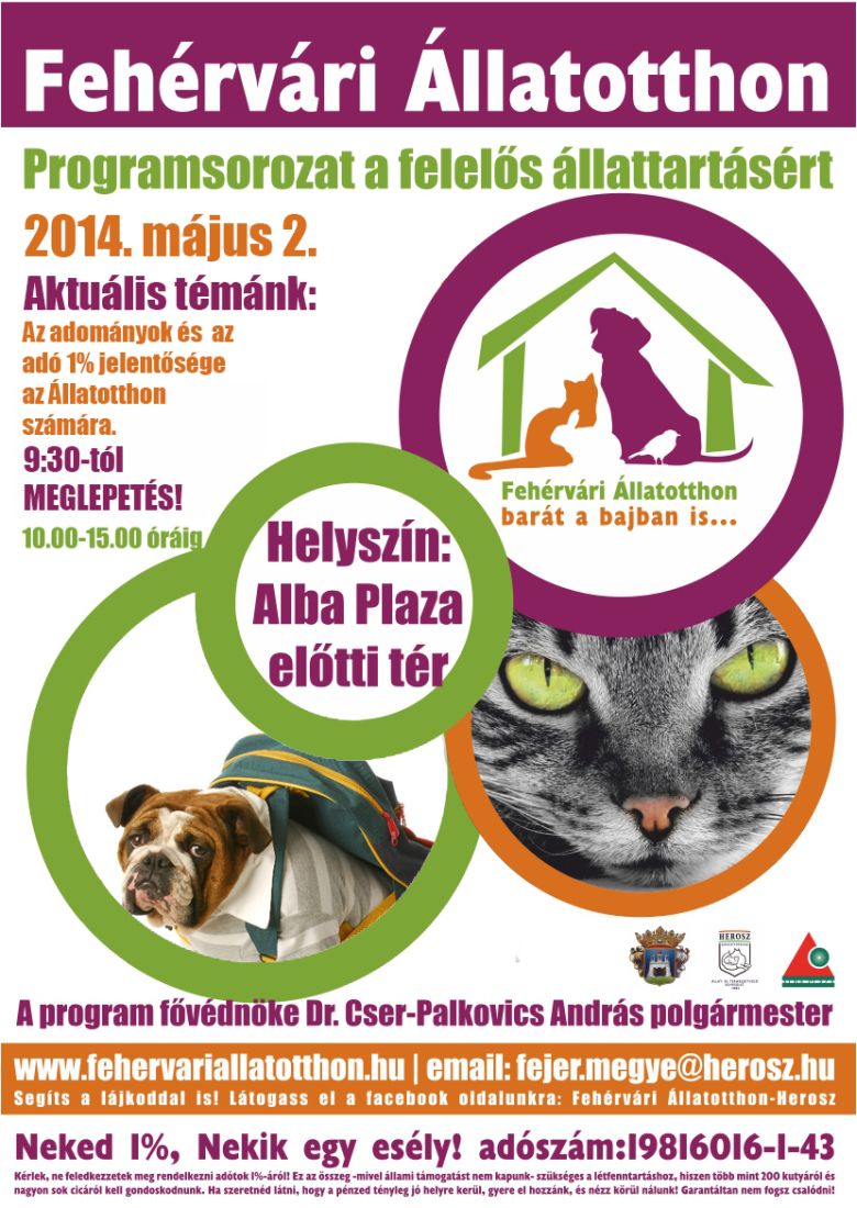 A tavalyi sikerekre való tekintettel idén is megrendezi a „Közelebb a polgárokhoz” című programsorozatát a HEROSZ Fehérvári Állatotthona. A menhely a következő hónapokban öt alkalommal települ ki a Belvárosba saját pavilonjával, hogy népszerűsítse tevékenységét. Az önkormányzat és az Alba Plaza támogatásával megvalósuló program megnyitóját május 2-án, pénteken rendezik a bevásárlóközpontnál.