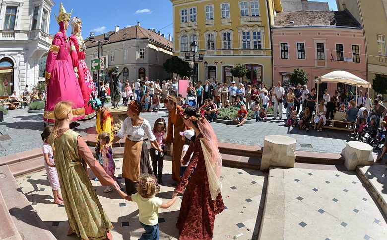 Érdemes lesz figyelni a Belvárosban megjelenő óriásbábokat, hiszen nemcsak látványosságként, hanem irányjelzőként is szolgálnak majd. Az idei év újdonsága, hogy mindhárom napon meg is szólalnak a bábok, amelyek a Koronázási Ünnepi Játékok attrakciójaként gólyalábas, zenés kísérettel vonulnak végig a szigetektől 14 és 17.30 órakor a Hotel Magyar Király előtti nagyszínpadig. A 13 bábra Adorján Viktor írt verseket és a Musica Historica zenésítette meg. A délutáni felvonulást a Bandiera zászlóforgató csoport zárja.