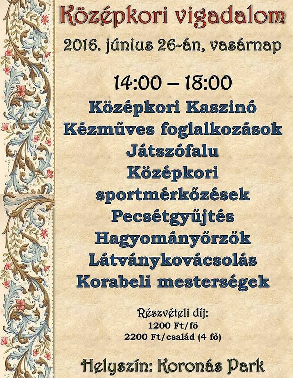 Június 26-án, vasárnap 14-18 óra között igazi középkori vigadalom várja a családokat a Koronás Parkban! A hétvégi rendezvényen többek között fegyverbemutató, középkori kaszinó, játszófalu, kézműves foglalkozások, látványkovácsolás és korabeli mesterségek is várják az érdeklődőket. A Koronás Park a rendezvény ideje alatt kizárólag belépőjeggyel látogatható!