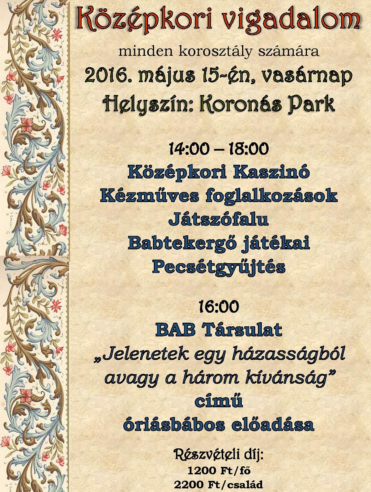 A Koronás Park május 15-én, vasárnap 14.00 és 18.00 óra között várja azokat a családokat, akik részesei kívánnak lenni egy igazi középkori vigadalomnak! 14.00 órakor indul a pecsétgyűjtés az ajándékokért! Koronás élményekben lesz része a résztvevőknek a Babtekergő játszótéren, ahol a Babtekergő Társulat ötféle gravitáción és emberi ügyességen alapuló játéka eleveníti fel a vásári komédiák, mutatványosok vidámsággal teli világát.
