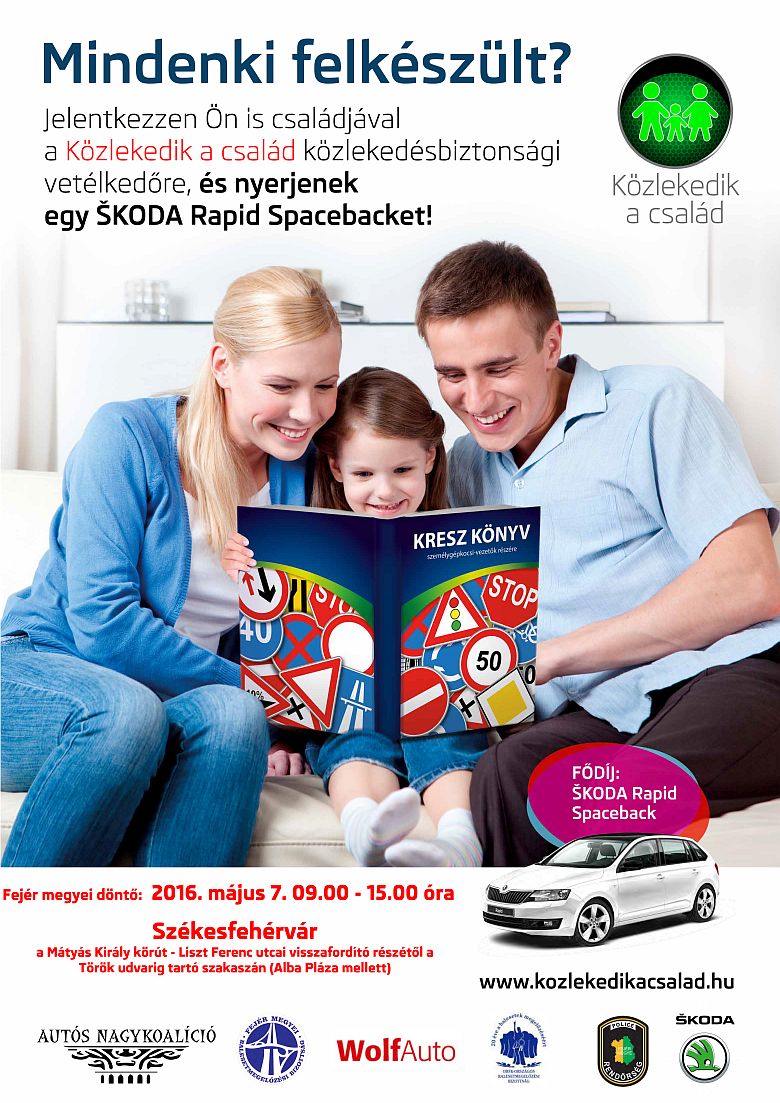 A területi versenyeket a fővárosi és a megyei balesetmegelőzési bizottságok bonyolítják le 2016. április 23 és június 04. között, az országos döntő június 18-19-én, Budapesten kerül megrendezésre. A Fejér megyei döntőre Székesfehérváron kerül sor május 7-én a Mátyás király körúton 9-től 15 óráig, a házigazda a Fejér Megyei Balesetmegelőzési Bizottság és a WolfAuto. A területi versenyre a verseny honlapján (www.kozlekedikacsalad.hu) elektronikus úton lehet jelentkezni május 6-ig, péntekig.