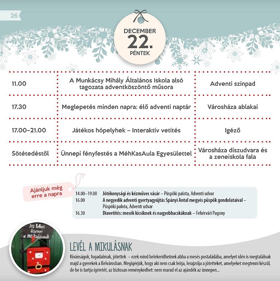 December 22-én, pénteken 14.00 és 19.00 óra között nyitva tart a Püspöki Palota Adventi Udvara, melynek jótékonysági és kézműves vásárában szebbnél szebb, minőségi kézműves portékákat kínálnak. A közös gyertyagyújtás 16.00 órakor kezdődik, ünnepi gondolatokat tolmácsol Spányi Antal megyés püspök.