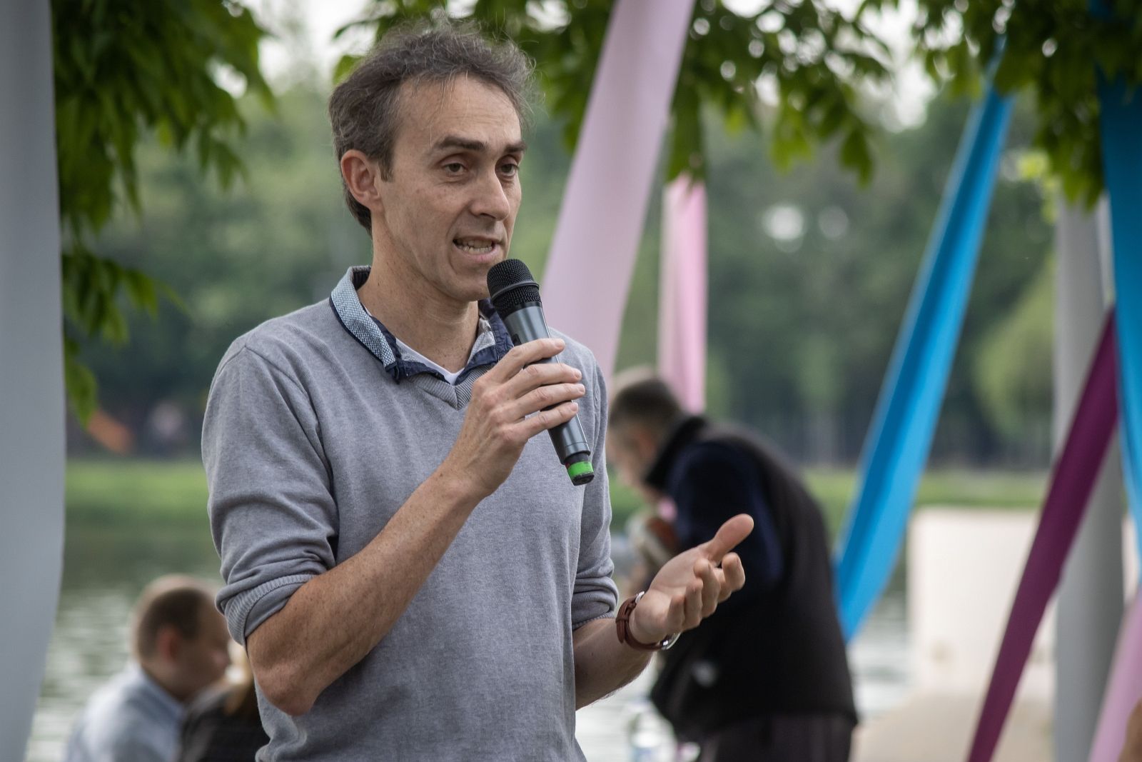 Az Ecsedi Mária által készített textilzászló fogadja a Csónakázó-tó partjára vezető sétányon az érkezőket.