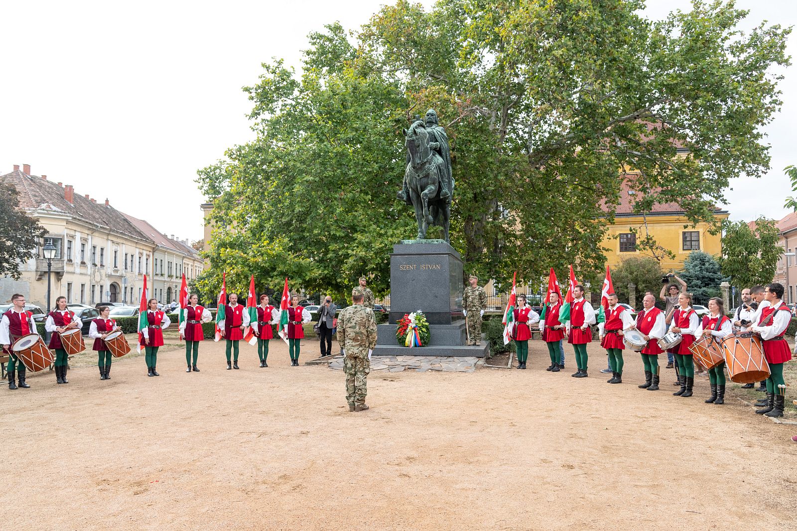 A Nemzeti Emlékhelyen tartott tiszteletadás után zászlóforgatók vezették az ünneplőket a Szent István térre, ahol koszorúzással tisztelegtek államalapítónk lovasszobránál. Vargha Tamás államtitkár, országgyűlési képviselő, Törő Gábor országgyűlési képviselő, dr. Simon László főispán, dr. Molnár Krisztián, a Fejér Megyei Közgyűlés elnöke, dr. Cser-Palkovics András polgármester, valamint Schmidt Zoltán vezérőrnagy, a Magyar Honvédség Parancsnoksága képviseletében kísérte a közös koszorút a főhajtáson.