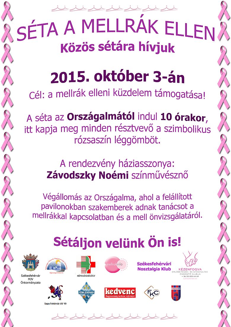 Október 3-án rendezik meg a "Séta a mellrák ellen" című közösségi sétát, amely a betegség elleni küzdelemre, illetve a szűrő- vizsgálatok fontosságára hívja fel a figyelmet. Az esemény megnyitója reggel 10 órakor az Országalmánál lesz, ahol a résztvevők megkapják a szimbolikus rózsaszín léggömböket.