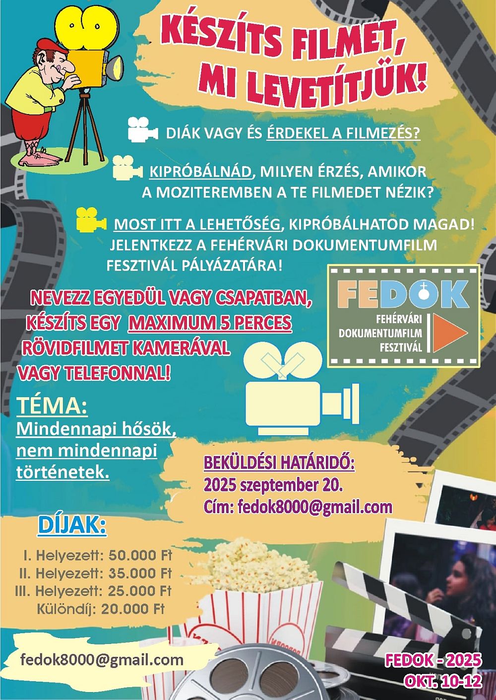 Ficsóri Erika, a Fesztivál főszervezője elmondta, külön is hangsúlyt fektetnek a fiatal generáció megszólítására: pályázatot írtak ki dokumentumfilm-készítésre. A Hétköznapi hősök nem mindennapi történetei témakörben készült filmeket szeptember 20-ig várják a fedok8000@gmail.com címre. A bármely technikával – kamera, mobiltelefon vagy táblagép – forgatott alkotások terjedelme maximum 5 perc lehet. Az alkotásokat Burján Zsigmond rendező-operatőr, Kovács Szilvia rendező-producer, televíziós szerkesztő és Preszter Elemér operatőr-tanár értékeli majd. A háromfős szakmai zsűri által legjobbaknak talált filmek alkotói utalványban részesülnek.
