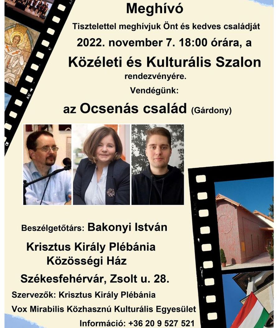 A Székesfehérvári Közéleti Szalon újabb rendezvényre hívja és várja az érdeklődőket. November 7-én este az Ocsenás család lesz Bakonyi István vendége. Helyszín a Krisztus Király Plébánia Közösségi Ház (Zsolt utca 28), a kezdési időpont 18 óra.