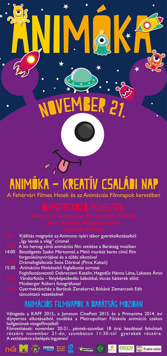 November 21-én kreatív családi napot rendeznek a Művészetek Házában, az animáció jegyében. Az Animóka elnevezésű rendezvényen kreatív foglalkozások, filmvetítések, gyermektáncház és sok minden más várja az érdeklődőket reggeltől estig. A családi napon levetítik a Kis herceg című animációs filmet és lehet fényképezkedni bábokkal, vicces hátterek előtt Mosberger Róbert fotográfussal.