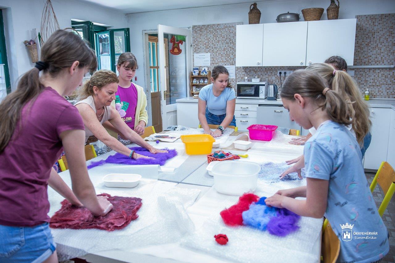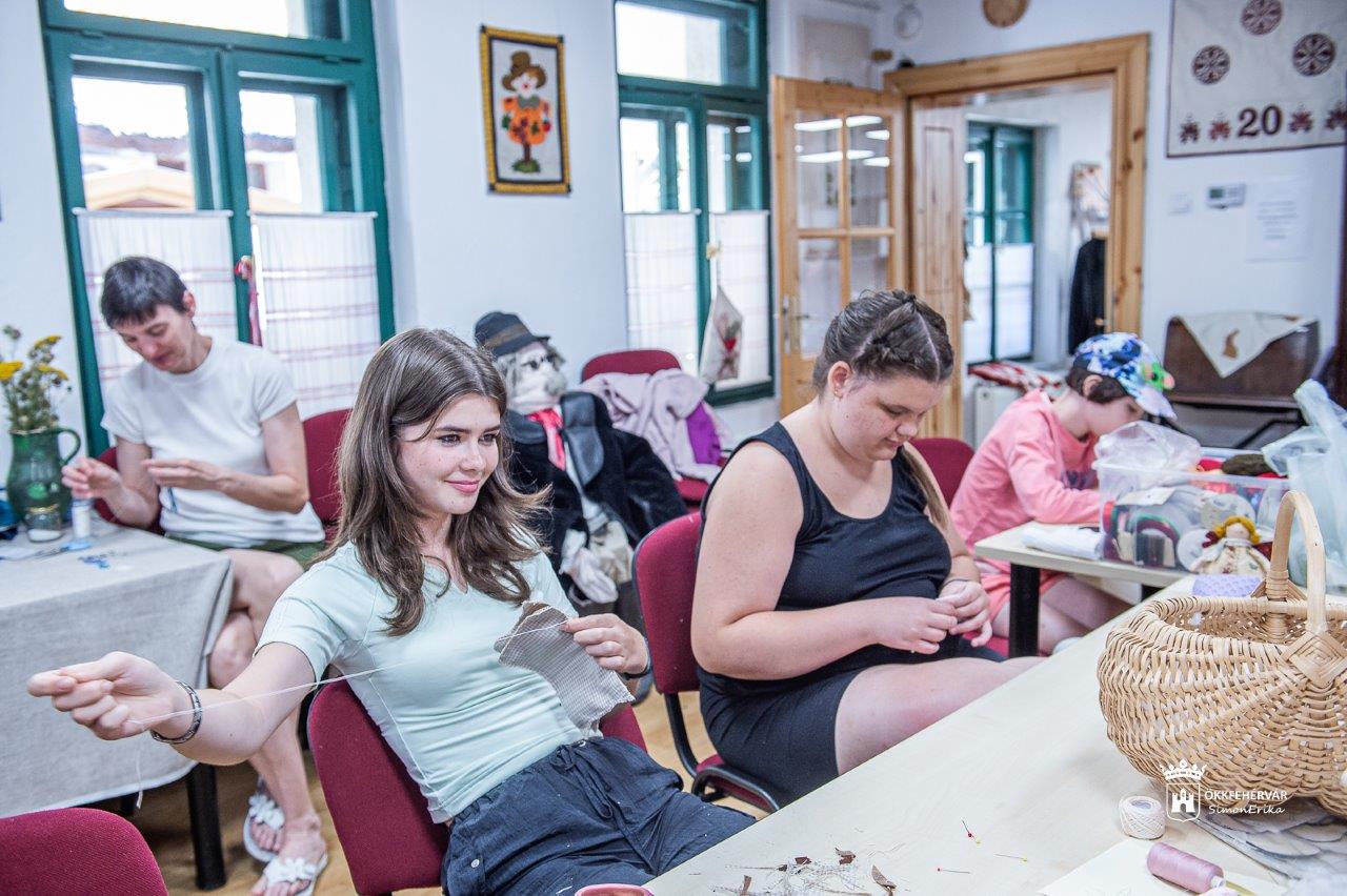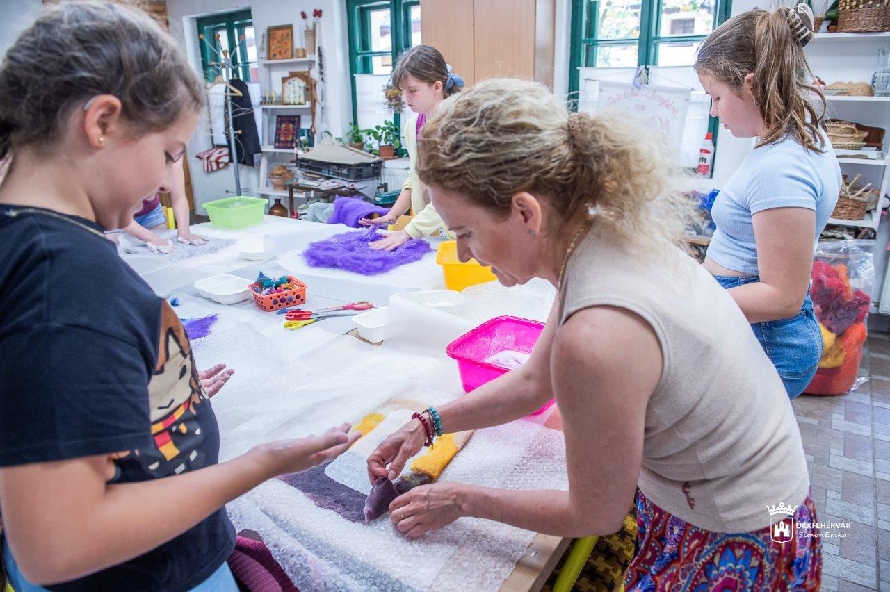 Évről évre visszatérő és új résztvevők is vannak ezen a héten a Gyermekműhely táborban, ahol az Egyesület mesterei foglalkoznak a gyerekekkel. Minden nap szerepel a programban a varrás, többféle öltéstechnika és a hímzés alapjainak elsajátítása, amit imádnak a gyerekek, emellett volt már gyöngyfűzés, nemezelés, csütörtökön számos szövési technikát ismernek meg a résztvevők, míg a pénteki záró napon a manapság újra divatját élő makramézás lesz a téma, ami a korábbi táborokban még nem volt. A Kézművesek Egyesülete kifejezetten nagy hangsúlyt helyez arra, hogy az elérhető legjobb minőségű, szép és természetes alapanyagokat használják a résztvevők – ez nem csak az gyermektáborban, hanem az év bármilyen más programján, felnőtt műhelyfoglalkozáson, szakkörökön is nagyon fontos szempont – hangsúlyozta Tóthné Albrecht Anikó textilműves, táborvezető.