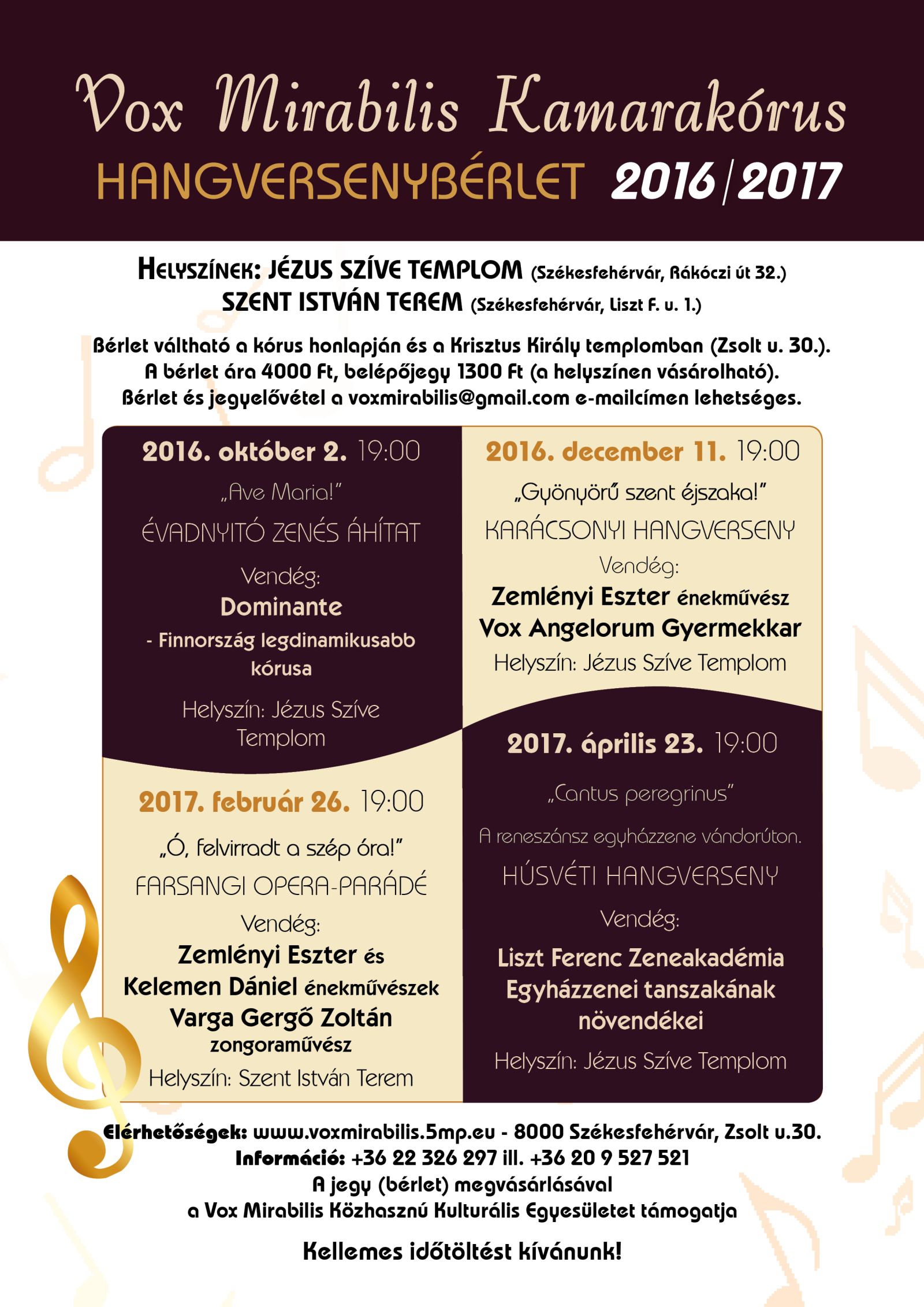 A Vox Mirabilis Kamarakórus négy koncertből álló hangverseny- bérlete a 2016/17-os évadra már kapható. Az idei, 6. évadban is meglepetésekkel, különlegességekkel készültek, neves művészek, együttesek közreműködésével. Az első koncert október 2-án 19 órakor lesz a Jézus Szíve Templomban.