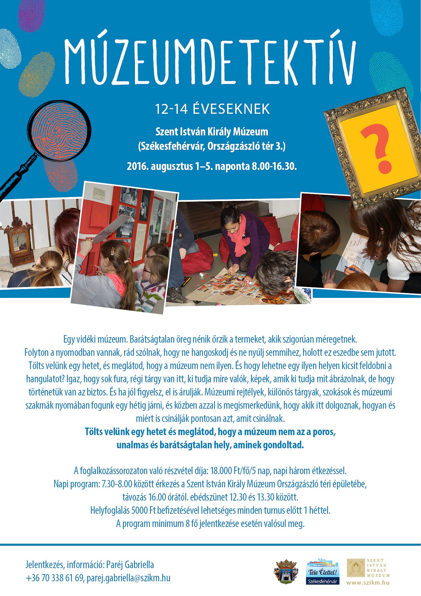 Múzeumi rejtélyek, különös tárgyak, szokások és múzeumi szakmák nyomában fognak járni egy hétig járni a Múzeumdetektív táboros gyerekek és közben azzal is megismerkednek, hogy akik itt dolgoznak, hogyan és miért is csinálják pontosan azt, amit csinálnak. A táborban azt is bebizonyítják, hogy a múzeum nem az a poros, unalmas és barátságtalan hely, aminek a gyerekek gondolják. A foglalkozássorozat augusztus 1-től zajlik a Szent István Király Múzeum Országzászló téri épületében, a program minimum 8 fő jelentkezése esetén valósul meg. Jelentkezni Paréj Gabriellánál lehet a +36 70 338 61 69 vagy parej.gabriella@szikm.hu címen július 25-ig.