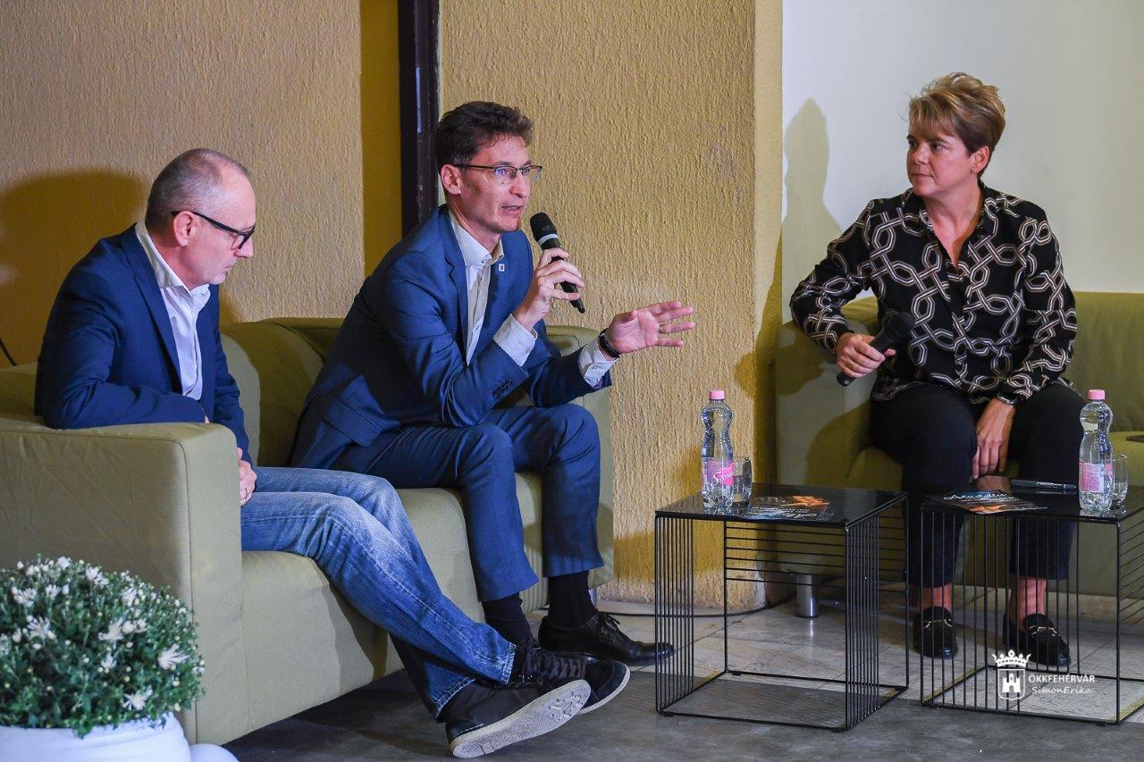 Egerházi Attila felidézte, hogy négy fővel indult el a társulat. Az elkötelezett hozzáállás, a szakmai alázat és a városba vetett hitük meghozta az eredményt. Ma már egy negyven fős, magyar és nemzetközi táncéletből érkezett társulattal készülnek a balett színházi évadra. A magas színvonalú produkciók biztosítékot jelentettek a városnak, és ez hozta magával a folyamatosan fejlődő infrastruktúrát. Jelenleg a VOK-ban van a székhelyük, ahol a próbák zajlanak, és a Vörösmarty Színházban mutatják be az elkészült darabokat. A beszélgetés során szó esett arról is, hogy a városnak komoly tervei vannak arra nézve, hogy több helyszínen is kialakítsanak olyan közösségi tereket, előadótermeket, játszóhelyeket, ahol a táncosok mellett az Alba Regia Szimfonikus Zenekar művészei is felléphetnek. Mint azt a polgármester elmondta, az előkészítő munkákat követően egy, másfél év múlva elindulhatnak ezek a fejlesztések, amelyekkel az a cél, hogy a város rendelkezzen a kamarateremtől a színháztermen át a többezer fő befogadására is alkalmas helyszínekig. A magas művészeti értékhez olyan hátteret szeretnénk teremteni, ami minden szinten a top kategóriába emeli Székesfehérvárt. A jó hangulatú beszélgetésen közreműködött a Vörös Janka X NEWSERIES, valamint a Székesfehérvári Balett Színház tagjai.