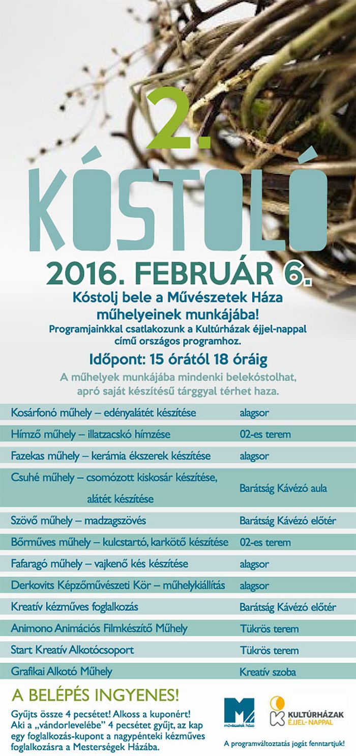 Másodszorra rendezik meg a Művészetek Házában a Kóstolót, amelyen a helyi szakkörök és a műhelyek foglalkozásait próbálhatják ki az érdeklődők február 6-án, szombaton 15 órától 18 óráig. A farsangi „mulatsággal” a Kultúrházak éjjel-nappal című országos programhoz csatlakoznak. A kézműveskedés szerelmeseit a Kosárfonó, a Hímző, a Fazekas, a Csuhé, a Szövő, a Bőrműves, a Fafaragó műhely, a Derkovits Képzőművészeti Kör, a Kreatív kézműves foglalkozás, az Animonó Animáció Filmkészítő Műhely, a Start Kreatív Alkotócsoport és a Grafikai Alkotó Műhely várja. A kedvcsináló tevékenységek között szerepel illatzacskóhímzés vagy vajkenő kés és kerámia ékszerek készítése is. A programról és pontos részletek ITT olvashat!