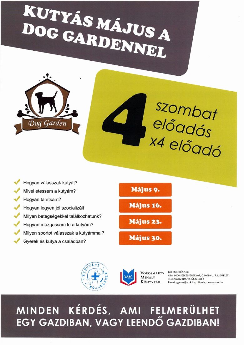 A kutyatartással kapcsolatban felmerülő fontos kérdésekre kaphatnak választ az érdeklődők a „Kutyás május” című előadás-sorozat keretében, amely a Dog Garden kutyapanzió és kutyanapközi, valamint több szervezet közreműködésével valósul meg. Az ingyenes programokra szombatonként, a délutáni órákban kerül sor a Vörösmarty Mihály Könyvtár Gyermekrészlegében.