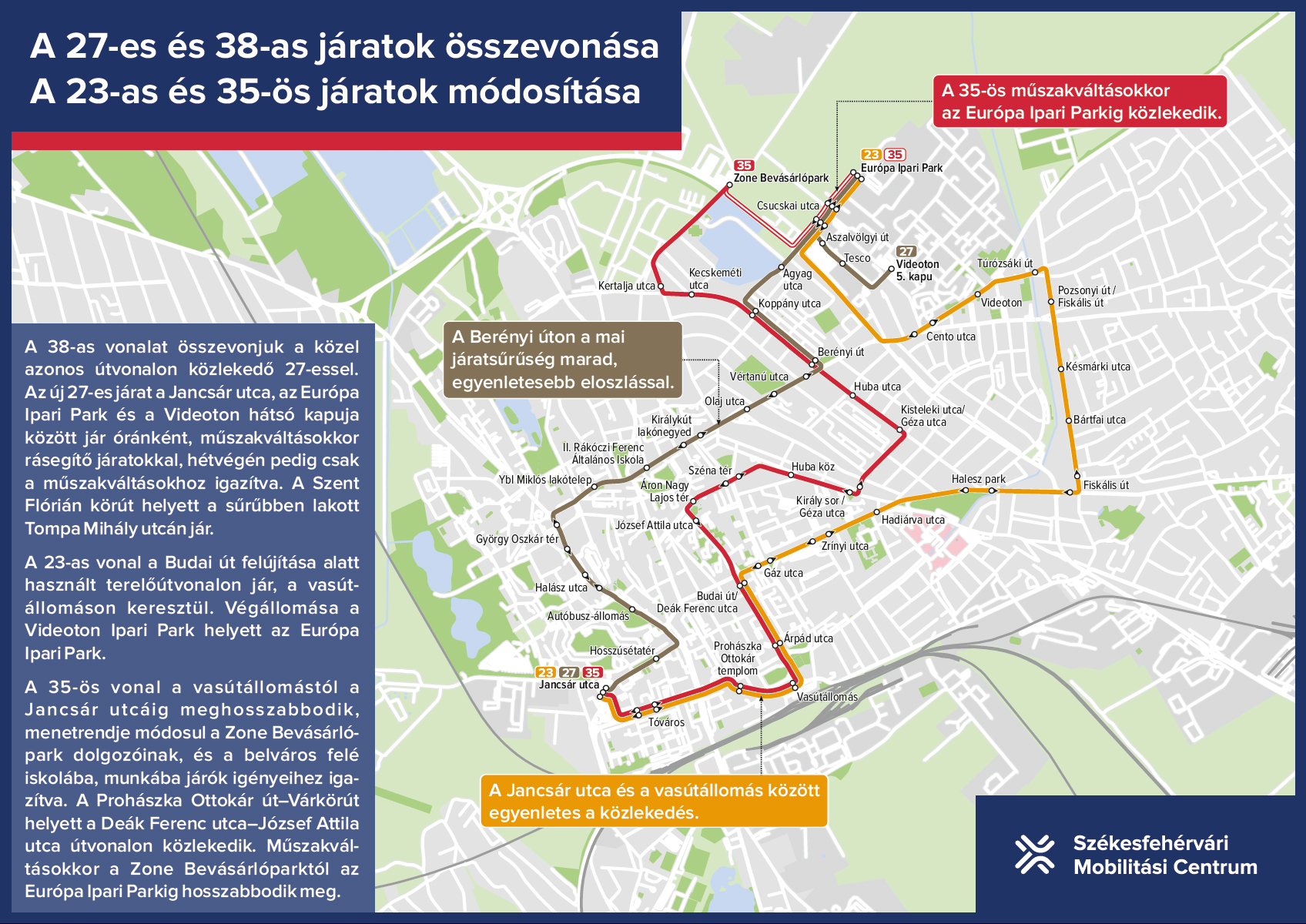 A 38-as vonalat összevonják a közel azonos útvonalon közlekedő 27-essel. Az új 27-es járat a Jancsár utca, az Európa Ipari Park és a Videoton hátsó kapuja között jár óránként, műszakváltásokkor rásegítő járatokkal, hétvégén pedig csak a műszakváltásokhoz igazítva. A Szent Flórián körút helyett a sűrűbben lakott Tompa Mihály utcán jár.
