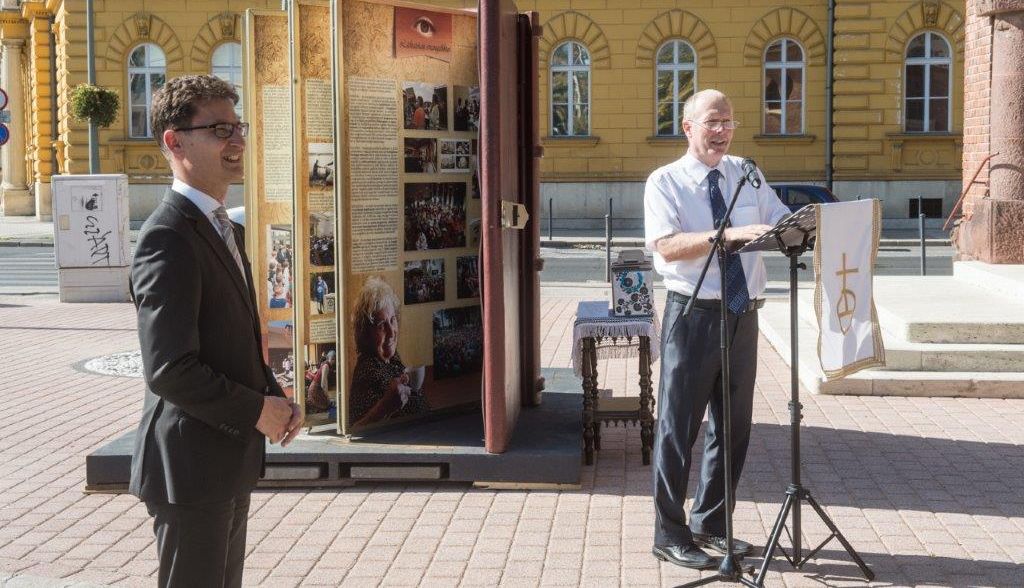 „Az én erőm erőtlenség által ér céljához. – mondja az Úr. Az evangélikus képeskönyv, az óriáskönyv Luther Márton bemutatásával kezdődik. Jó is, ha a reformáció évében nem csak a fogalommal ismerkedünk meg, hanem a történettel is, azzal, hogyan újult meg az egyház, hogy a szentlélek milyen erővel formálta a történelmet, és az emberi szíveket egyaránt. Hogyan használ fel filozófiai irányzatokat és mégis, azoktól nem függve szabadon mutatja meg az evangélium csodáját.” – tette hozzá. A könyv egy hónapon keresztül lesz látható, lapozható a Jávor Ottó téren. Az ünnepélyes megnyitót követően a Korál-sziget együttes adott koncertet.