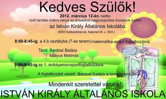 Március 12-én hétfőn nyílt tanítási órákra várják a leendő első osztályosok szüleit az István Király Általános Iskolában. Reggel 8 és 8.45 óra között a 4.b osztályban - 7-es tanteremben - tartanak matematika és angol foglalkozásokat Bárdosi Balázs és Mátyus Melinda pedagógusok. 9 órától 9.45 óráig az 1. évfolyamon tanuló fiúknak zajlanak sportfoglalkozások Bárdosi Balázs vezetésével a tornateremben.