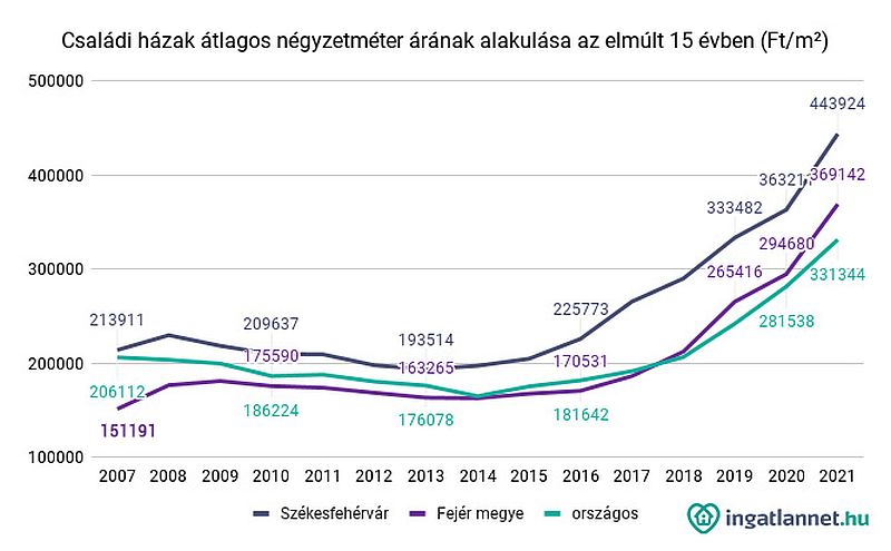 Ha hosszabban tekintünk vissza a Fejér megye székhelyén eladó használt ingatlanok átlagos árszínvonalára, kijelenthetjük, hogy 2007 augusztusa óta a lakóingatlanok átlagosan 152%-kal drágultak, azaz több, mint 2,5-szeres ár tapasztalható idén, mint 15 esztendővel megelőzően. Ez meghaladja az ugyanezen idő alatt országosan megfigyelhető drágulást. A Magyarországon eladásra kínált összes ingatlantípus átlagos négyzetméter ára ugyanis másfél évtized alatt nem egészen a duplájára nőtt: 92,8%-kal emelkedett ugyanis országszerte a használt ingatlanok kínálati ára.