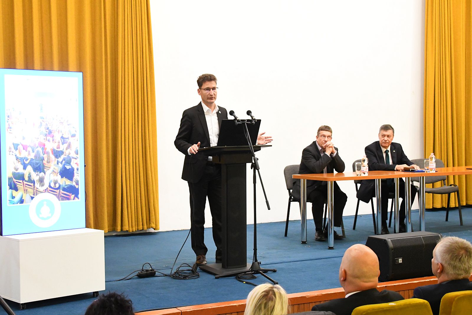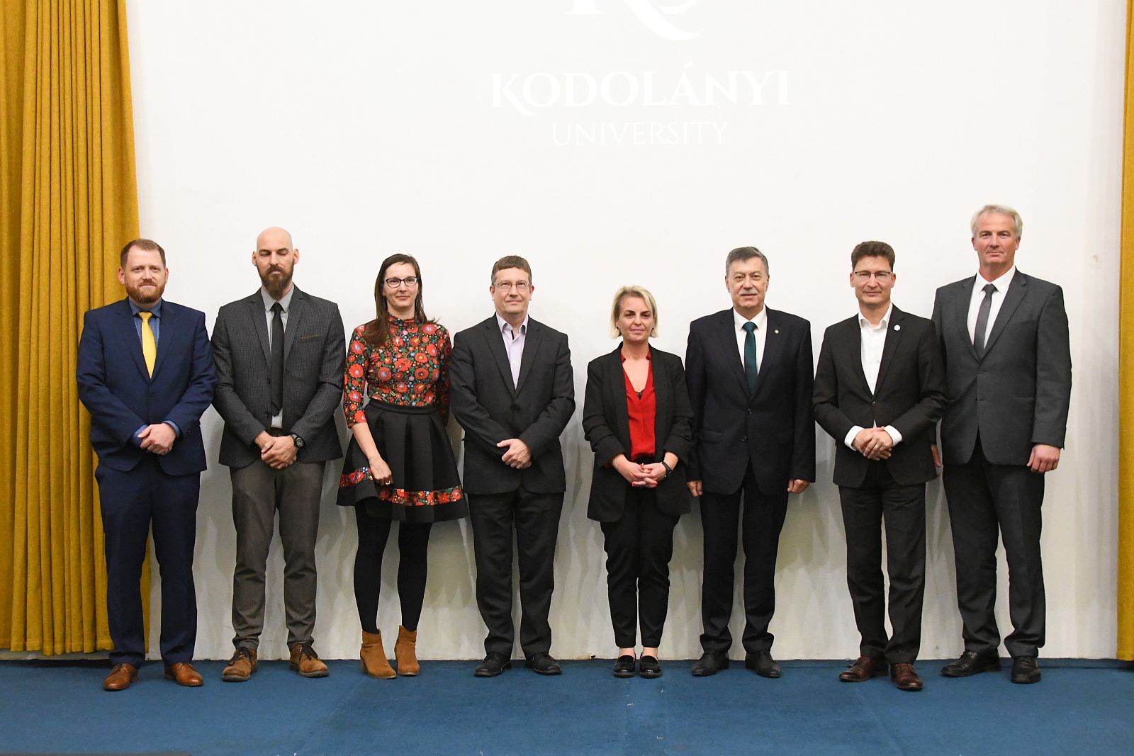 Dr. Cser-Palkovics András polgármester köszöntője elején leszögezte: az egyetemi autonómia kiemelten fontos kérdés, amit mindenki, így az Önkormányzat is tiszteletben tart. Ezzel párhuzamosan azonban a város és az intézmény közös érdeke, hogy a Kodolányi János Egyetem Székesfehérváron és a többi képzőhelyén is fejlődni tudjon. Ahogy a városvezető fogalmazott, Székesfehérvár amellett, hogy a kultúra és a sport városa, egy olyan iparral rendelkezik, amilyen kevés van az országban. „Ez a gazdasági erőcentrum akkor fenntartható és növelhető, ha a felsőoktatási struktúrát is fejleszteni tudjuk. Ebben kiemelt partnerünk a Kodolányi János Egyetem és az Óbudai Egyetem Alba Regia Műszaki Kar. Örülök azoknak a célkitűzéseknek, amiket a rektorok megfogalmaztak, hiszen a szándék egyértelmű: erősíteni a Kodolányit, az egyetemi képzést, a diákéletet és mindazt, amit ez adni tud a városnak és az agglomerációnak.” – fogalmazott dr. Cser-Palkovics András, aki üdvözölte az egyetem törekvéseit és beszélt a Kodolányi János Gimnázium kiemelt szerepéről is. A polgármester elmondta: önmagában is rendhagyó, hogy a középiskola az egyetemhez kapcsolódhat, ez pedig egy olyan kiszámíthatóságot nyújt a diákoknak, amivel erősödhet a kötődésük a városhoz. Elmondta, hogy az Ybl Miklós Szakgimnázium felújítása után a Kodolányi János Gimnázium főépülete is felújításra kerül, a jövőben pedig akár az itt élő külföldi családok diákjainak bázisa is lehet. Dr. Cser-Palkovics András megköszönte azt a kiemelkedő együttműködési készséget, ami az egyetem és a város közötti kapcsolatot mindig is jellemezte.