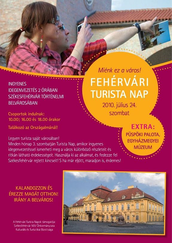 Harmadik alkalommal rendezzük meg a Fehérvári Turista Napot. A februári főpróba sikere után bevezetett programsorozat keretében minden hónap 3. szombatján Turista Napot tartunk. Ezeken a napokon a fehérváriakat buzdítjuk arra, hogy legyenek turisták saját városukban, és jöjjenek el egy ingyenes idegenvezetéses városnézésre. A program egyik csalogató eleme, hogy minden alkalommal bevisszük a csoportokat egy-egy olyan helyszínre, ahová máskor nem, vagy csak ritkán lehet bemenni. A program szervezője a Székesfehérvári Turisztikai Közhasznú Nonprofit Kft. és a támogató Székesfehérvár MJV Önkormányzata Kulturális és Turisztikai Bizottsága célja ezzel a programsorozattal az, hogy bevonják a helyibelieket a turisztikai áramkörbe részben, mint látogatókat, részben, mint a város arculatát meghatározó érzelmileg elkötelezett polgárokat. Az eddig megtartott rendezvényekre több százan látogattak el, akik örömmel indultak a város felfedezésére, és ugyanilyen örömmel várják a következő lehetőséget is.