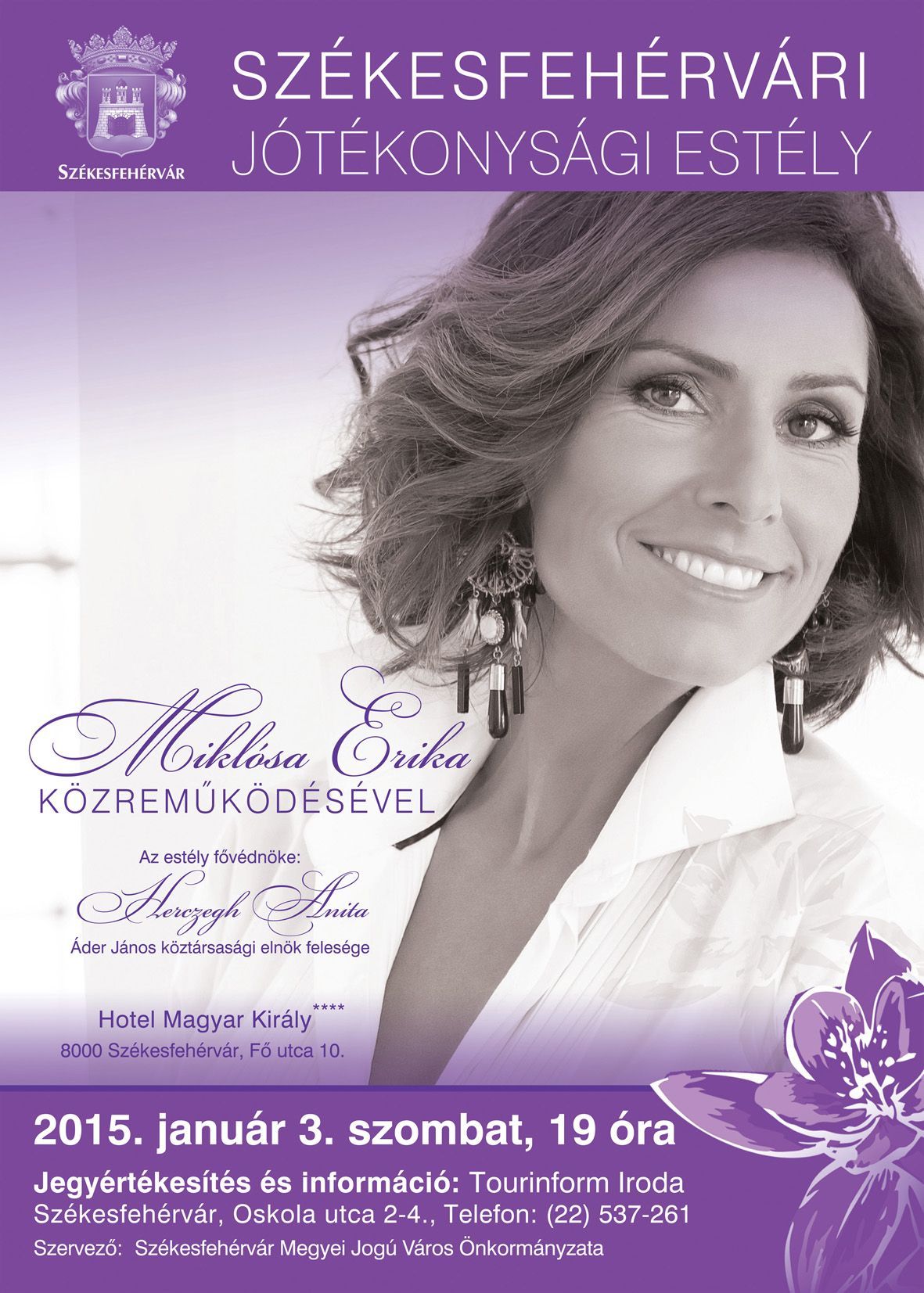 A Székesfehérvári Jótékonysági Estélyt negyedik alkalommal rendezik meg hagyományosan az új esztendő első szombatján, 2015. január 3-án, 19.00 órától a Hotel Magyar Királyban. A program főszereplője ezúttal is Miklósa Erika operaénekes lesz, aki számos szállal kötődik már a városhoz. A Kossuth-díjas művész az egyik legnagyobb magyar tenoristával, Horváth Istvánnal együtt fog fellépni, közös, jókedvű harmonika estjüket hozzák el Fehérvárra.