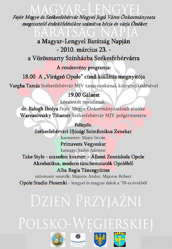 Székesfehérvár lengyel testvérvárosából Opoléből és Fejér megye testvérmegyéjéből Opole vajdaságból érkeznek vendégek Székesfehérvárra. Vargha Tamás elmondta: "régóta szorgalmazom, hogy az igazi kapcsolat nem a városvezetők közötti kapcsolatot jelenti, hanem a városok intézményei, egyesületei és civil szervezetei közötti barátságot." A kétnapos program során a Hiemer-házban szakmai találkozó lesz, amin a sport, az oktatás és a turisztika kerül a középpontba. Ugyancsak hétfőn este a közös találkozó helyszíne a Petőfi Mozi-ban lesz, ahol magyar és lengyel költők verseit egymás nyelvére lefordítva adják majd elő. Kedden a színházban gálaműsor is lesz Virágzó Opole címmel nyílik kiállítás és az előcsarnokban a lengyel barátok egy húsvéti asztallal készülnek, ahol lengyel népszokásokat mutatnak majd be. A színházi gálaműsor pedig 19 órakor kezdődik.| Négy éve márciusban a lengyelek és magyarok közötti sok évszázados szoros barátság szellemében tartott nagyszabású rendezvényen Lech Kaczyñski lengyel és Sólyom László magyar államfők Győrben a Bem József téren avatták fel az első köztéri Magyar-Lengyel Barátság Emlékművet. Három éve pedig az Országgyűlés és a lengyel szejm is március 23-át a magyar–lengyel barátság napjává nyilvánította. |