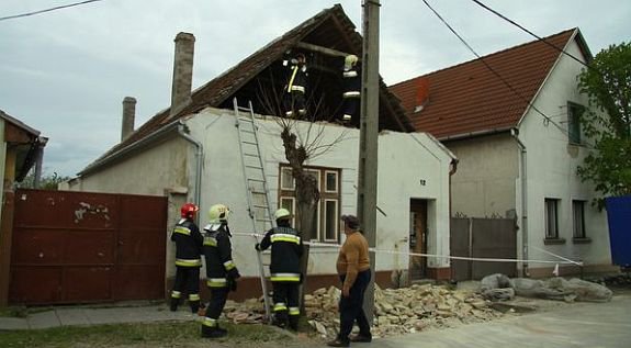 A Fátra utcában egy családi ház téglából épült csúcsfala dőlt le a járdára, a vízelvezető árokba és az út egy részére. A leomló téglák félig leszakították az épületbe vezető elektromos vezetéket. A tűzoltók a ház előtti területet körbekerítették, a tetőszerkezet szélén lévő cserepeket eltávolították, majd a padlástérben a fafödémet fóliával takarták le.