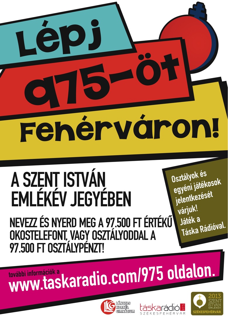 A Szent István Emlékév jegyében rendezi meg „Lépj 975-öt Fehérváron” elnevezésű játékos városismereti vetélkedőjét a Táska Rádió. A versenyre Fejér megyében tanuló diákok - felsősök és középiskolások - jelentkezhetnek. A nyeremény egy 97.500 forint értékű okostelefon és 97.500 forint osztálypénz lesz. A játék október 21-én indul, a versenyzőknek napi egy könnyű és heti egy nehéz feladatot kell megoldaniuk.