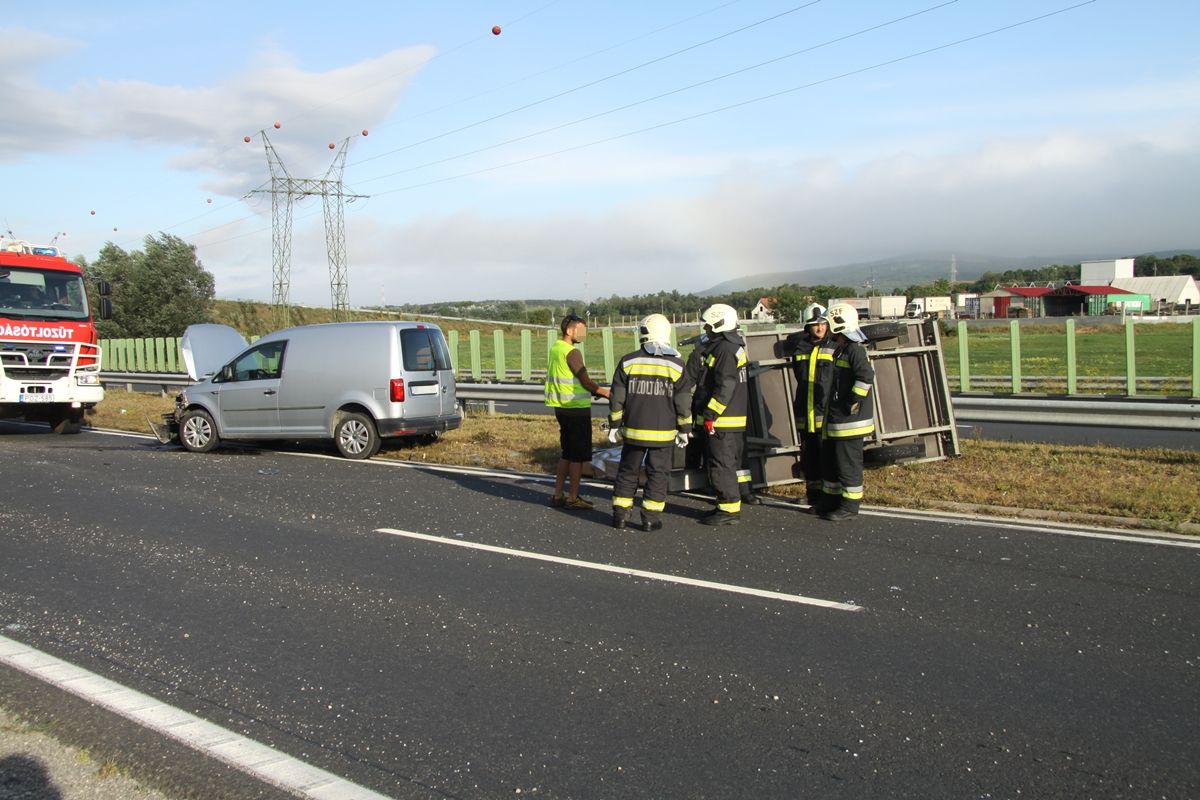 Utánfutót vontató kisáruszállítóval ütközött egy személygépkocsi augusztus 5-én reggel a 8-as főúton, Csór és Székesfehérvár között. A személyautó az út menti árokba csapódott. A kisáruszállító keresztbe fordult az úton, utánfutója leszakadt és a rajtalévő üvegezett teraszajtóval felborult.