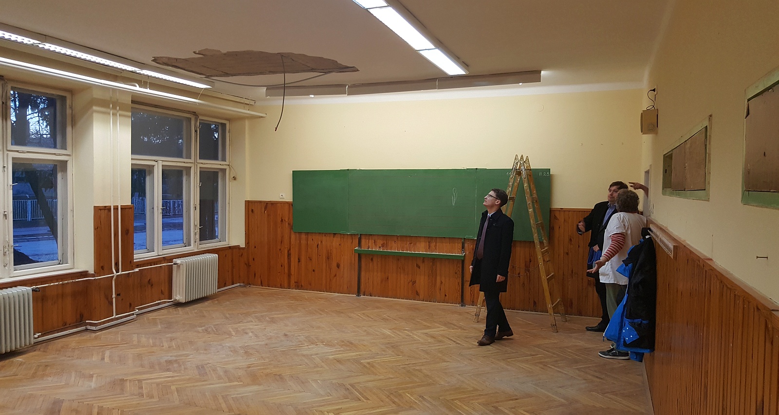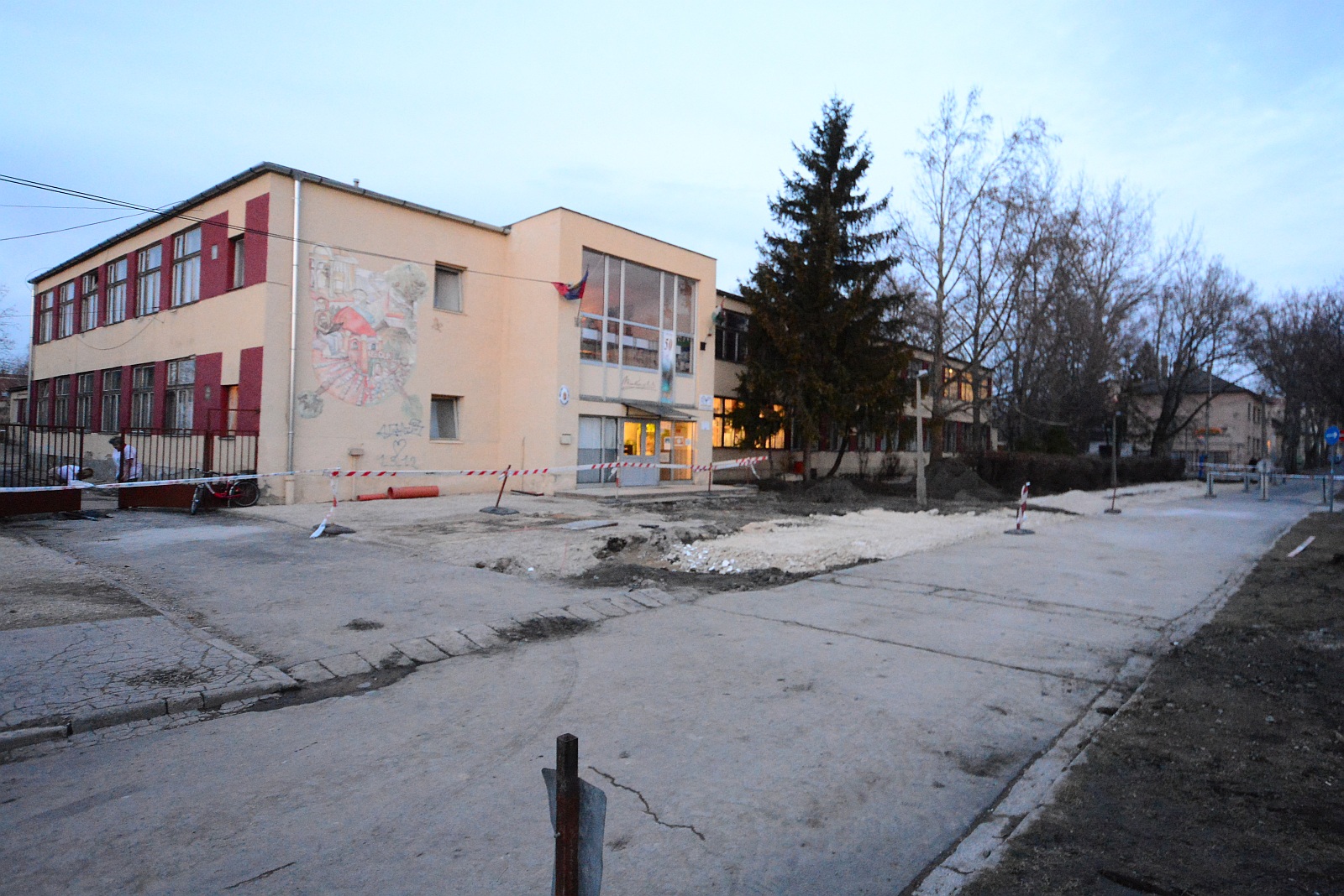 Az iskola előtti tér felújítása elkezdődött és valószínűleg az ott használt döngölőgépek által keltett rezgés is hozzájárult ahhoz, hogy levált a vakolat a plafonról.