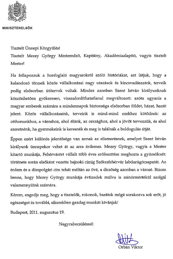 "Mezey György... történelme során elsőként vezette bajnoki címre Székesfehérvár labdarúgócsapatát, az érdem és a Díszpolgári cím tehát méltán az övé, a dicsőség azonban a városé. Bízom benne, hogy Mezey György munkája zsinórmértékül szolgál valamennyiünk számára. Engedje meg, hogy a tisztelők, barátok és rokonok mögé sorakozva sok erőt, jó egészséget és további sikerekben gazdag munkát kívánjak." - írta levelében Magyarország miniszterelnöke abból az alkalomból, hogy Székesfehérvár Megyei Jogú Város Önkormányzat Közgyűlése a város sportéletében végzett kimagasló edzői munkája elismeréseként Székesfehérvár Díszpolgára díjat adományozott dr. Mezey Györgynek.
