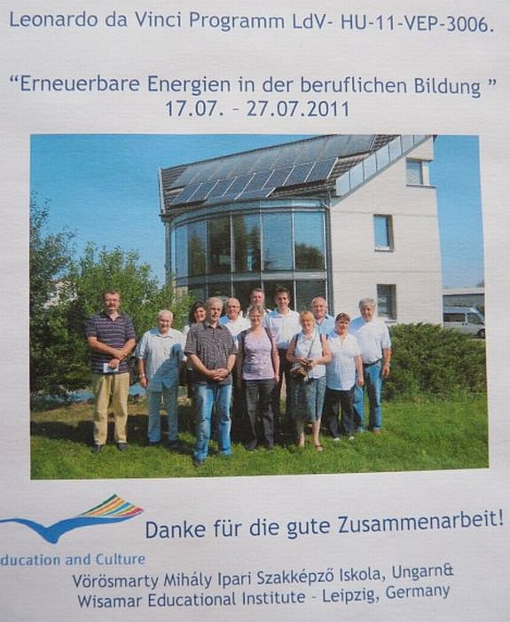 Hivatalosan is lezárul a Leonardo program, melynek keretében a Tempus Közalapítvány támogatásával gyűjtöttek ismereteket a Vörösmarty Mihály Ipari Szakképző Iskola oktatói és tanárai a megújuló energiák hatékony, naprakész oktatásához. A korábbi pályázattal ellentétben most főként idősebb kollégák ismerkedhettek a számukra új, alternatív megoldásokkal.