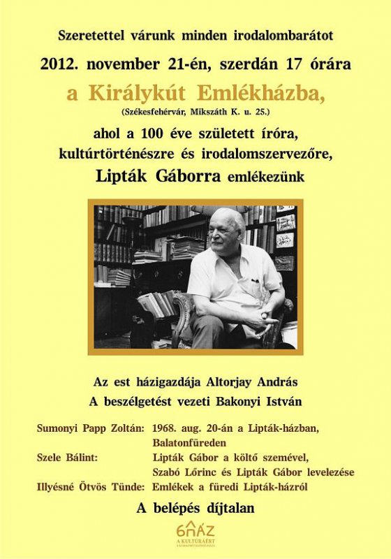 A 100 éve született íróra, kultúrtörténészre és irodalomszervezőre emlékeznek 21-én szerdán este 17 órakor, a Királykút Emlékházban, a Mikszáth Kálmán utca 25-szám alatt. Az est házigazdája Altorjay András lesz, a beszélgetést Bakonyi István vezeti. Az estére a belépés díjtalan, a szervezők mindenkit szeretettel várnak.
