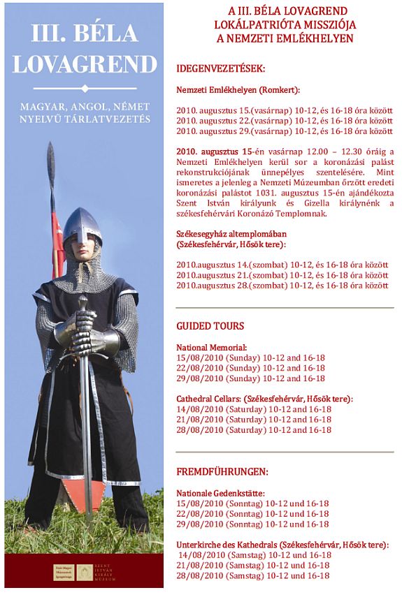 A III. Béla Lovagrend magyar, angol és német nyelvű idegenvezetést tart a királyok sírhelyénél augusztus 15, 22 és 29, vasárnapjain délelőtt 10 és 12 óra, valamint délután 16 és 18 óra között a Középkori Romkert – Nemzeti Emlékhelyen. Fejér megye legrégibb világi alapítású lovagrendje hagyományteremtő szándékkal, idén már harmadik alkalommal tart többnyelvű idegenvezetést a Fejér Megyei Múzeumok Igazgatóságával kötött megállapodás alapján.