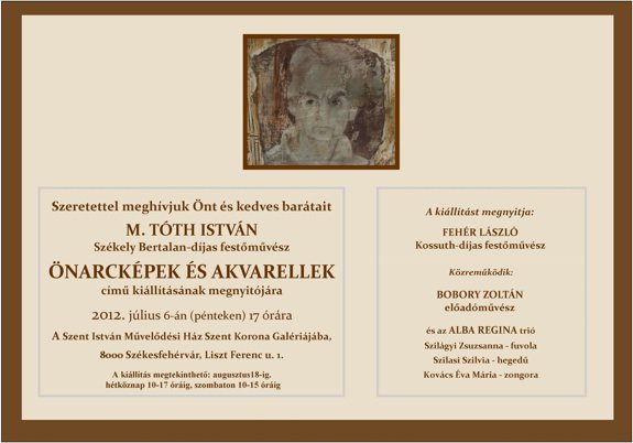 Két kiállítással is várja a látogatókat a Szent István Művelődési Ház júliusban. A Szent Korona Galériában M. Tóth István Székely Bertalan-díjas festőművész Önarcképek és akvarellek című tárlatát Fehér László Kossuth-díjas festőművész nyitja meg július 6-án pénteken 17 órától. A kiállítás augusztus 18-ig látogatható. A Szent Cecília teremben - Mozdulatlan pillanat a gondolat tükrében címmel - Kisné Laczkó Mónika és Kis Szabolcs természetfotó és vers kiállítása látható július 13-ig.