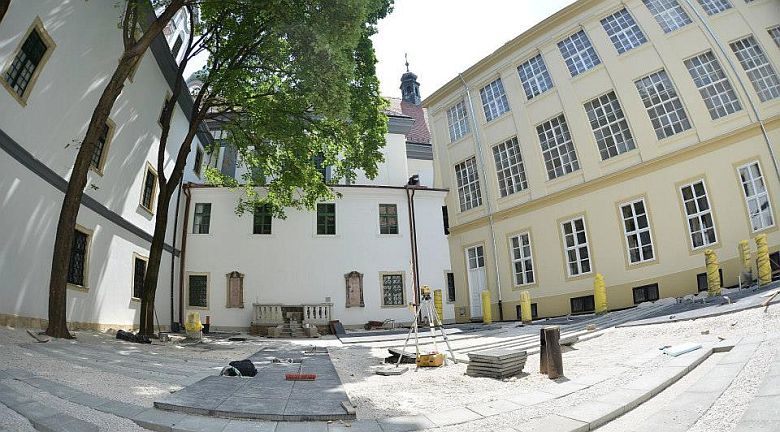 A hűs fák árnyékában hamarosan azt is megtapasztalhatják a látogatók, hogy milyen fenséges az akusztikája. A felújított díszudvar hivatalosan kedden kerül átadásra, s az Alba Regia Jazz Fesztivál és Verseny keretében „tesztelhetik” a látogatók a hely adottságait. (A kép két héttel ezelőtt készült, amikor javában tartottak még a munkálatok.)