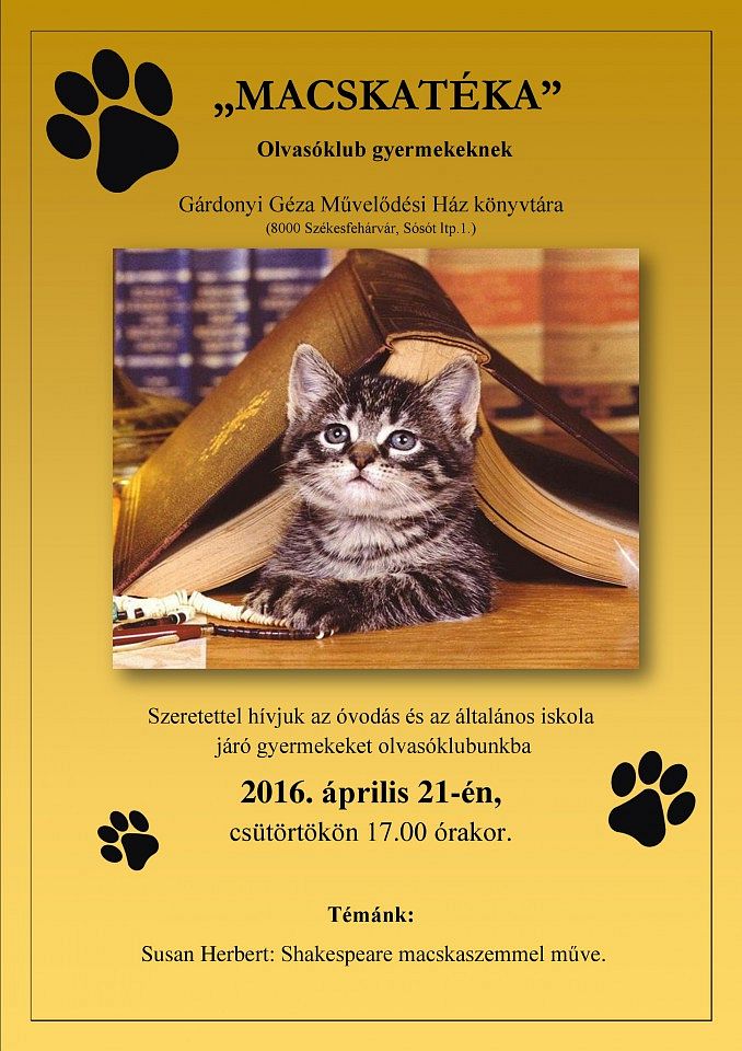Szeretettel hívják az óvodás és az általános iskolás korú gyermekeket a Gárdonyi Géza Művelődési Ház olvasóklubjába 2016. április 21-én 17.00 órától. A téma ezúttal Susan Herbert: Shakespeare macskaszemmel műve lesz. A könyv Shakespeare leghíresebb drámáinak meghatározó jeleneteit ábrázolja macska szereplőkkel, korhű jelmezekben.