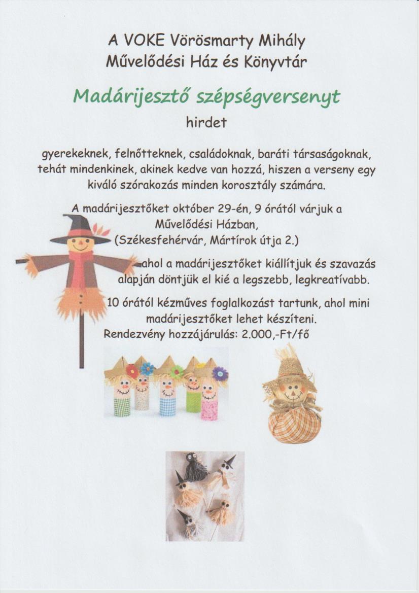 A madárijesztőket október 29-én, kedden 9.00 órától lehet leadni a Mártírok útja 2. szám alatti intézményben. Az alkotásokat kiállítják és szavazás alapján döntik el, hogy kié a legszebb, a legkreatívabb. Ezen a napon 10 órától kézműves foglalkozást tartanak, ahol mini madárijesztőket lehet készíteni.