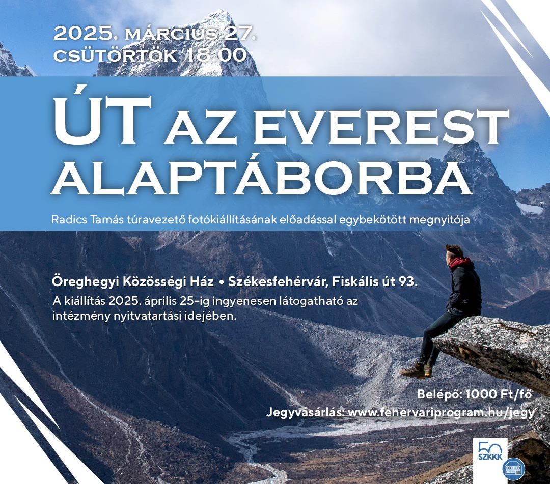 A világ legmagasabb hegyének alaptáboráig vezető útról és állomásairól készített képeit állítja ki az Öreghegyi Közösségi Házban (Székesfehérvár, Fiskális út 93.), melynek megnyitóján előadással hozza közelebb ezt a világot az érdeklődőkhöz.