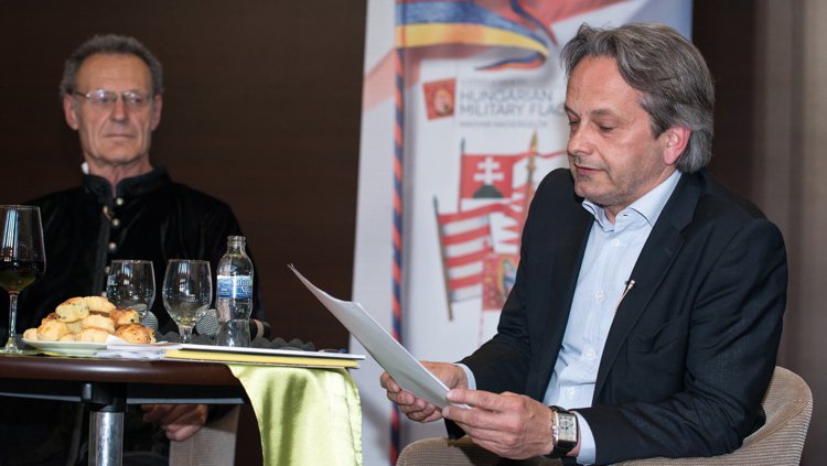 Somogyi Győző: Magyar hadizászlók című könyvének nyilvános bemutatójára került sor a Vörösmarty Színház Cyrano kávézójában. A kötetben megtalálhatóak legrégebbi zászlaink, a kora újkori magyar zászlók, valamint a nemzeti hadsereg és a magyar honvédség zászlói is. A Kossuth-díjas grafikussal, aki negyven éve kutatja és rajzolja a magyar történelmi viseleteket Vargha Tamás honvédelmi államtitkár beszélgetett.