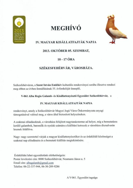 A fennállásának 55. évfordulóját ünneplő V–061 Alba Regia Galamb- és Kisállat Tenyésztő Egyesület Székesfehérvár október 5-én rendezi meg a IV. Magyar Kisállatfajták Napját. A szakmai előadásoknak a Városháza felújított Díszterme ad otthont. Az esemény a Szent István Emlékév kulturális rendezvényeinek sorába illeszkedik.