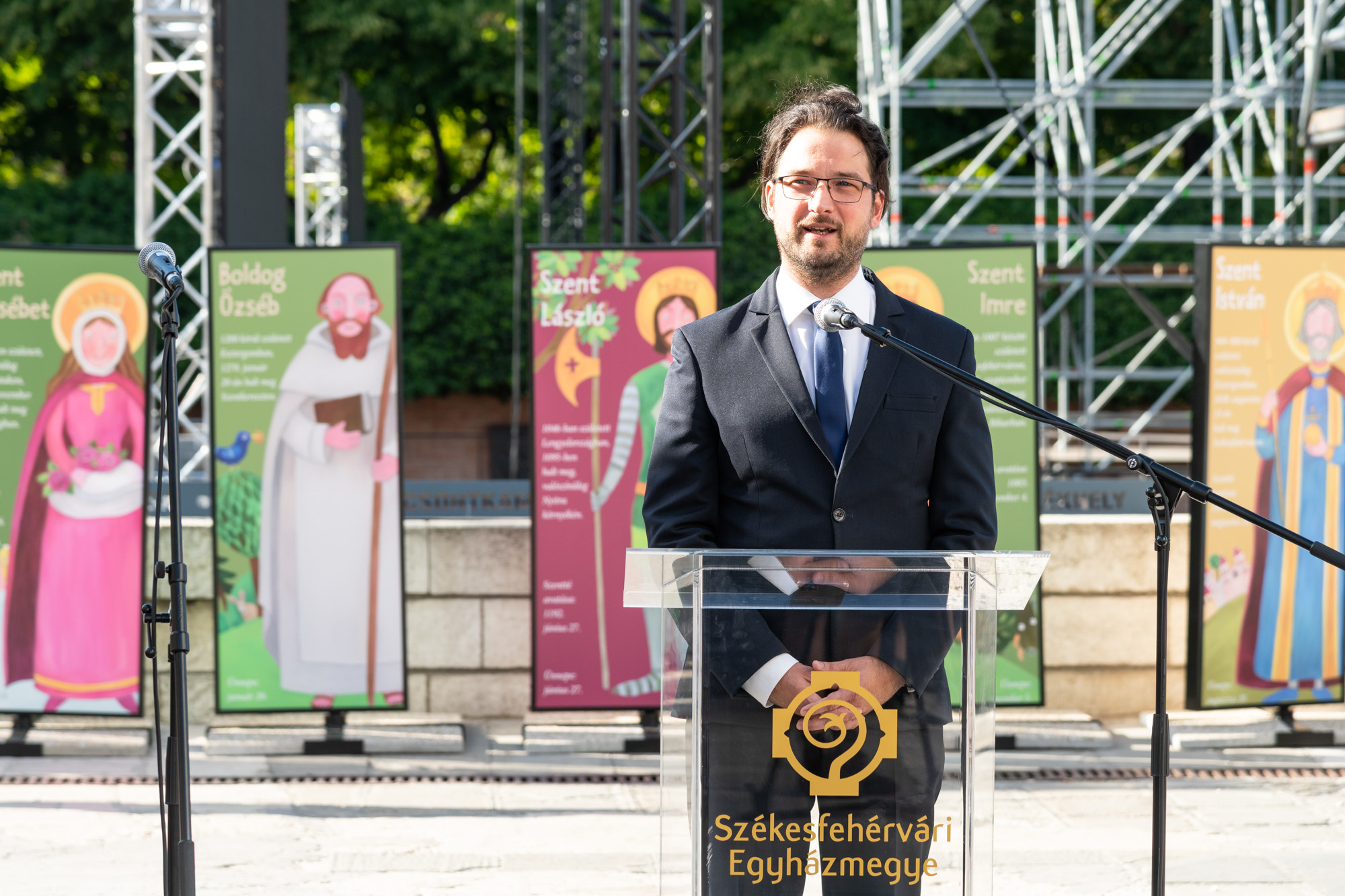 A Kállai Nagy Kriszta grafikus kiadványokba készített illusztrációiból nyílt tárlaton Spányi Antal megyéspüspök mondott köszöntőt, majd Smohay András, a Székesfehérvári Egyházmegyei Múzeum igazgatója nyitotta meg a szabadtéri tárlatot.