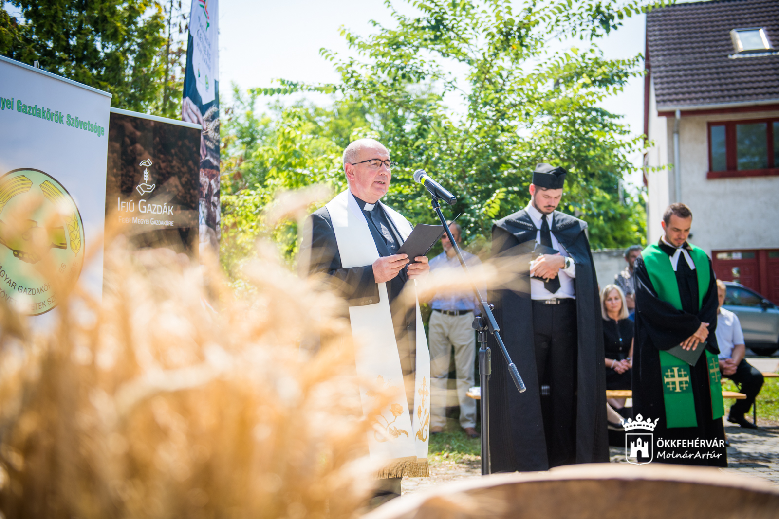 A Fejér megyei gazdák felajánlását Ugrits Tamás, a Székesfehérvár Egyházmegye püspöki irodaigazgatója, Oláh Pál Olivér református lelkész és Ribárszki Ákos evangélikus helyettes esperes közösen áldott meg.