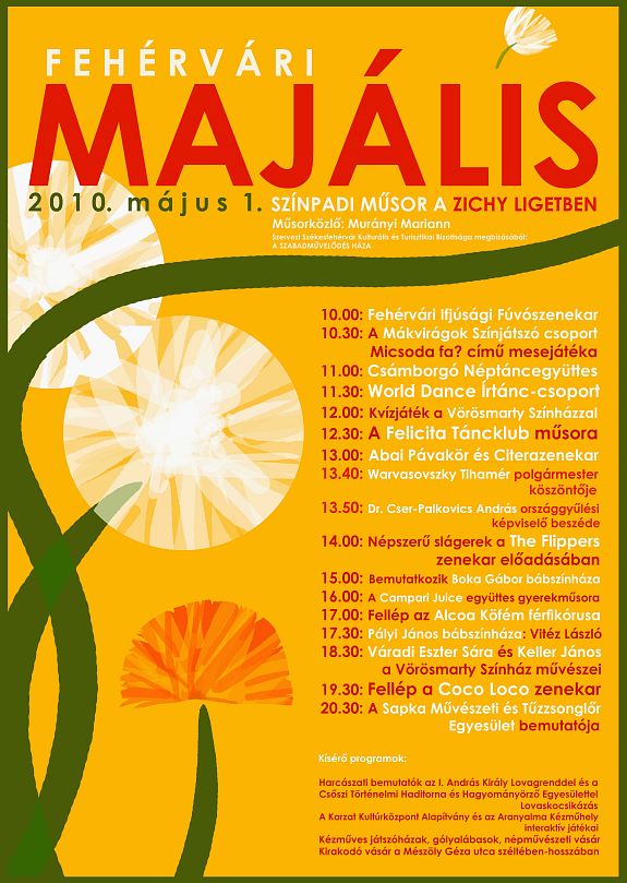 Számos esemény várja majd a fehérváriakat május elsején a Zichy ligetben, ahol zenekarok és néptánc- együttesek lépnek fel, valamint bábszínház is lesz. A kísérő programok között harcászati bemutató, kézműves játszóház és népművészeti vásár is szerepel. A programsorozatot a Coco Loco zenekar koncertje után tűzzsonglőr bemutató zárja.
