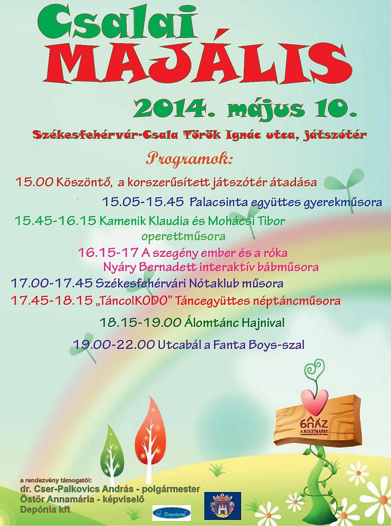 Május 10-én, 15 órától a korszerűsített játszótér átadásával kezdődik az idei csalai majális, majd a zenéé és a táncé lesz a főszerep: 15 órától a Palacsinta zenekar zenél, majd Kamenik Klaudia és Mohácsi Tibor énekel operett-slágereket. 16.15 órától bábműsor következik, de lesz néptánc és álomtánc, a nap végén pedig buli a Fanta Boys-szal. A rendezvényt dr. Cser-Palkovics András polgármester, Östör Annamária képviselő és a Depónia Kft. is támogatja.