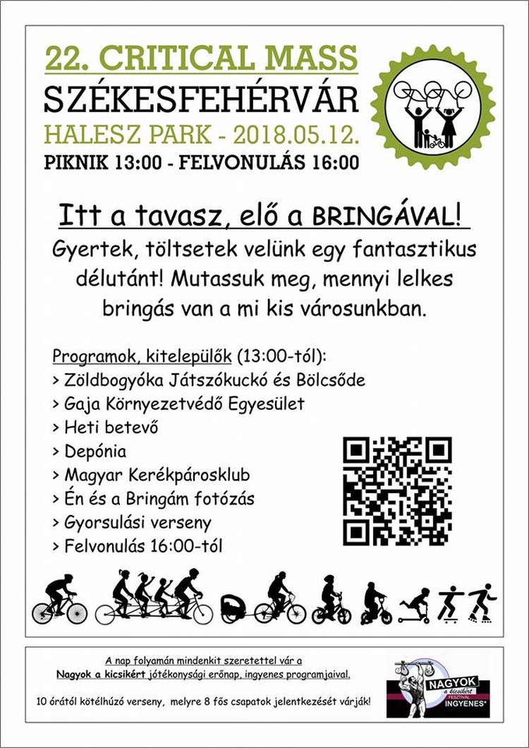 Május 12-én rendezik a 22. Critical Mass kerékpáros felvonulást Fehérváron. A hagyományos felvonulás 16 órakor indul Halesz ligetből, de már délután egy órától színes programokkkal várják a bringásokat a parkban, ahol délelőtt a Nagyok a kicsikért jótékonysági erőnap programjai várják a fehérváriakat.