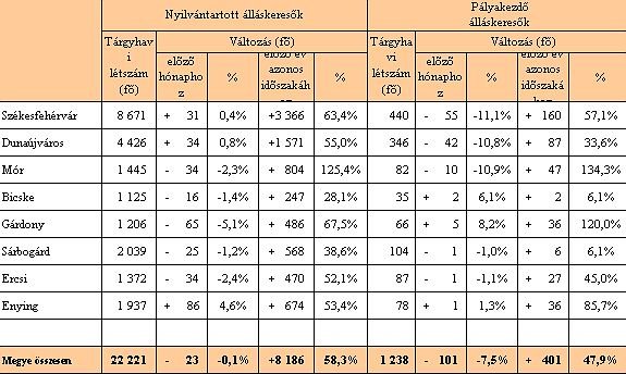 Májusban 58.647 fő szerepelt a Közép- dunántúli Regionális Munkaügyi Központ nyilvántartásában, ez 424 fővel kevesebb áprilishoz képest. Székesfehérváron áprilishoz képest májusban 31 fővel nőtt a munkanélküliek száma, míg előző év azonos időszakához képest 63,4%-al, 3366 fővel többen szerepelnek a nyilvántartásban.