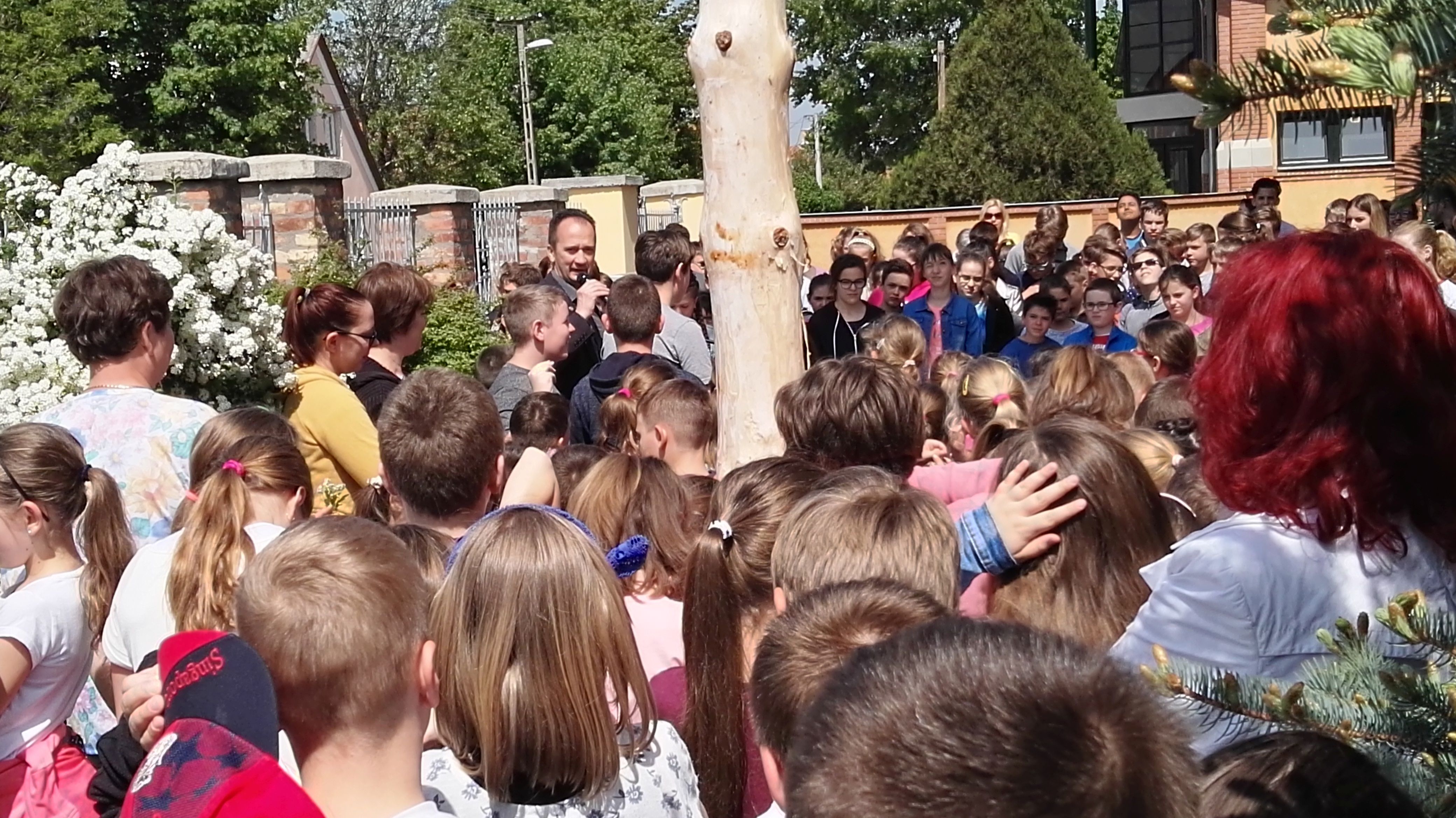 Délelőtt májusfát állítottak a Felsővárosi Általános Iskola udvarán. A tavaszi ünnepi programban több apuka közreműködött: a hagyományőrzés jegyében maguk vágták ki, maguk háncsolták, díszítették, majd létrák segítségével állították fel a májusfát.