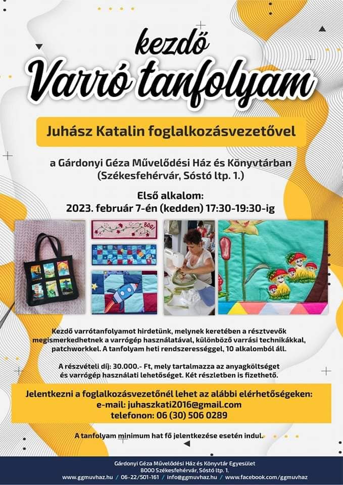 A varrás iránt érdeklődőket február 7-én, kedden 17.30 órától várja Juhász Katalin foglalkozásvezető. A kétórás összejöveteleken a kezdők megismerkedhetnek a varrógép használatával, a különböző varrási technikákkal, a patchworkkel. A tanfolyam heti rendszerességgel zajlik majd, összesen 10 alkalomból áll. A részvételi díj: 30.000.- Ft, mely tartalmazza az anyagköltséget és a varrógép használati lehetőséget is. Jelentkezni a foglalkozásvezetőnél lehet a juhaszkati2016@gmail.com e-mail címen, vagy a 06 (30) 506 0289 telefonszámon. A tanfolyam minimum hat fő jelentkezése esetén indul.