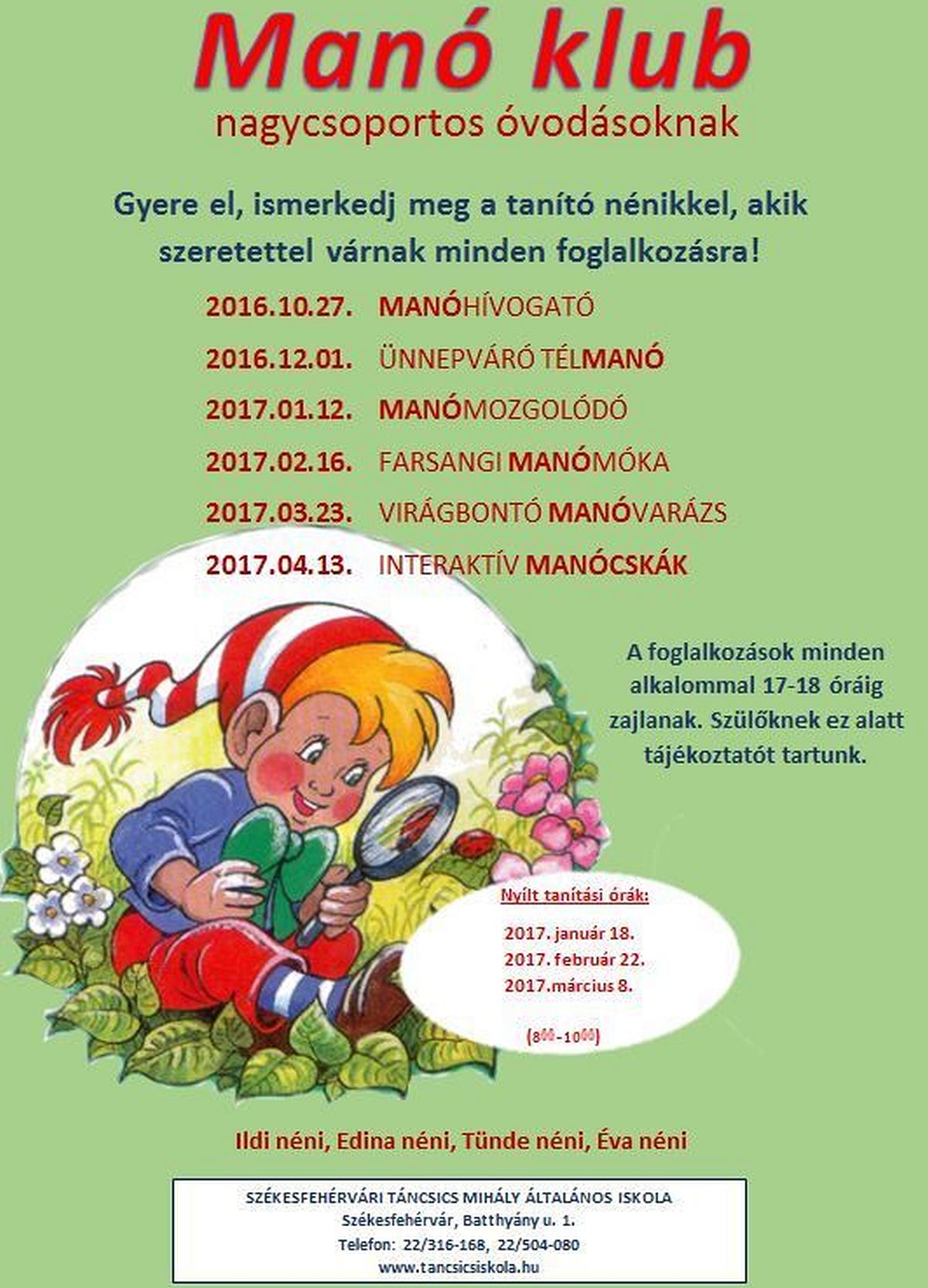 Folytatódik a Manó Klub a Székesfehérvári Táncsics Mihály Általános Iskolában. Az intézmény szeretettel várja a nagycsoportos óvodásokat a MANÓmozgolódó című játékos iskolaváró foglalkozásra január 12-én, csütörtökön, 17.00 órakor. A délután folyamán bemutatkoznak a tanító nénik is. A szervezők kérik, hogy a gyerekek hozzanak magukkal tornacipőt a foglakozásra.